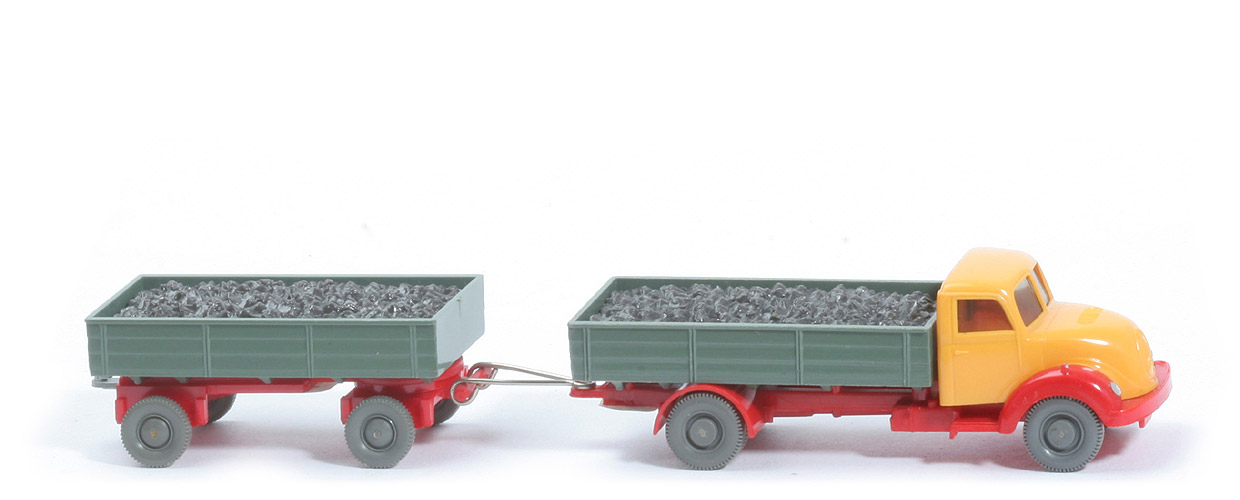 Farbe Kabine | chromgelb | Verglasung | getönt | Bemalung vorn | Scheinwerfer, Blinker | Chassis Farbe | rot | Chassis Art | 2. Version | Kupplung vorn | ohne | mittlerer Chassisbereich | geschlossen | Chassis Bodenprägung | WM | Pritsche Art | Normpritsche | Pritschenseiten | waagerechte Gravuren | Rückleuchten | bündig an Rückwand | Kennzeichen | einteilig | Pritsche Farbe | dunkelresedagrün | Pritscheneinlage | ohne | Bemalung Rückleuchten | ohne | Bemalung Kennzeichen | ohne | Räder | 11mm, glatt, hellgrau |