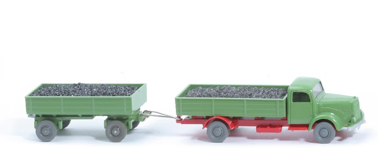 Nicht im GK. Resteverwertung Werbemodell THYSSEN. Hier mal mit einem Anhänger 400/13a in maigrün mit Kohlenladung. |