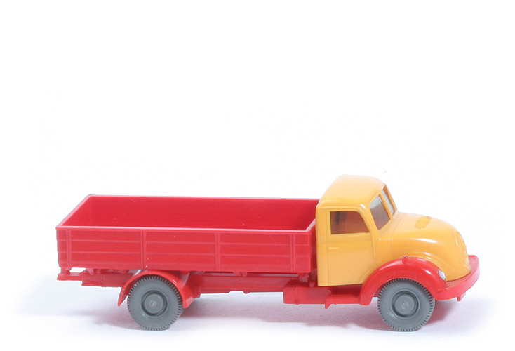 Farbe Kabine | chromgelb | Verglasung | getönt | Bemalung vorn | Scheinwerfer, Blinker | Chassis Farbe | blassrot | Chassis Art | 2. Version | Kupplung vorn | ohne | mittlerer Chassisbereich | geschlossen | Chassis Bodenprägung | WM | Pritsche Art | Normpritsche | Pritschenseiten | waagerechte Gravuren | Rückleuchten | bündig an Rückwand | Kennzeichen | zweiteilig | Pritsche Farbe | rot | Pritscheneinlage | ohne | Bemalung Rückleuchten | ohne | Bemalung Kennzeichen | ohne | Räder | 11 mm glatt |
