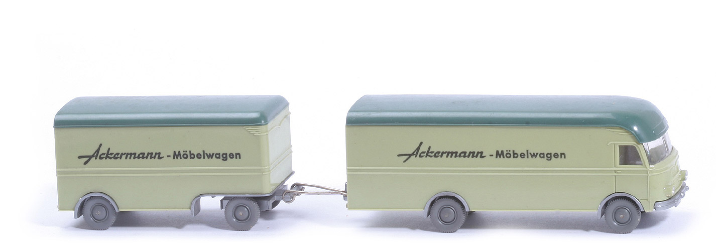 | Zugwagen | Aufbau Farbe | lindgrün | Blinker vorne | ohne | Verglasung | klar | Inneneinrichtung | silbern | Fahrer | ohne | Kotflügel | Teil des Chassis | Rückleuchten | klein | Dach Farbe | hellpatinagrün | Dach Art | glänzend, ohne Positionsleuchten | Türen | hellpatinagrün | Türen Art | Typ 2: hoch, mit Rand, mit Griff | Chassis Art | Typ 3 | Chassis Farbe | silbern | Bodenprägung Motorblock | WM | Bodenprägung hinten | WIKING GERMANY | Achshalterung vorne | geschlossen | Achshalterung hinten | offen | Fläche unter hinterem Kardan | geschlossen | Fläche hinter Hinterachse | geschlossen | Tank | ohne | | Anhänger | Aufbau Farbe | lindgrün | Kotflügel | Teil des Chassis | Dach Farbe | hellpatinagrün | Dach Art | glänzend, ohne Streben | Türen | hellpatinagrün, hoch, mit Griff | Chassis Farbe | silbern | Bodenprägung | WIKING GERMANY mit 50a | Beschriftung | Ackermann Möbelwagen, Druck | Räder | 10mm hellgrau |