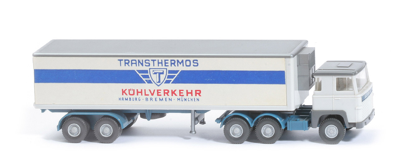 | Zugmaschine | Dach | basaltgrau | Kabine oben | altweiß | Kabine unten | altweiß | Stoßstange | basaltgrau | Frontbeschriftung | Scania schmal | hier Farbhinterlegung | azurblau | Grill Prägung | mit 110 | Scheinwerfer | in der Stoßstange, gesilbert | Spiegel | ohne | Scheibenwischer | ohne | Lenkrad | ohne | Sattelpfanne | für großen Königsbolzen | Reserverad | ohne | Farbe Chassis | azurblau | Radlauf | azurblau, 2-teilig | Räder | 12mm, Profil grob | Felgen | silbergrau | | Auflieger | Kofferdach | silber | Koffer Korpus | altweiß | Türen | silber | Kühlaggregat | mit | Chassis | azurblau | Achseinheit | azurblau | Beschriftung Seite | Transthermos (s. Foto) | Räder | 12mm, Profil grob | Felgen | silbergrau | Art der Beschriftung | ganzflächiger Papieraufkleber |