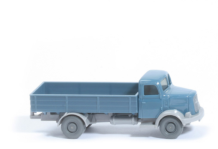 Farbe Kabine | hellazurblau | Verglasung | getönt | Grill | silbern eingesetzt | Bemalung | Scheinwerfer | Chassis Art | 1. Version: offen | Blinker | ohne | Chassis Bodenprägung | WM | Chassis Farbe | silbergrau | Pritsche Art | Normpritsche | Pritschenseiten | waagerechte Gravuren | Rückleuchten | eingerückt | Kennzeichen | zweiteilig | Pritsche Farbe | mattgraublau | Pritscheneinlage | ohne | Bemalung Rückleuchten | rot | Bemalung Kennzeichen | silbern | Räder | 11 mm, Glattwand |