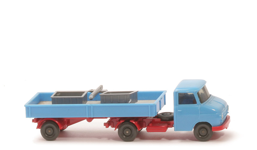 | | Zugwagen | | Farbe Kabine | babyblau | | Haube | schräg | | Dach | glatt | | Verglasung | getönt | | Bemalung | ohne | | Reserverad | flach hinter Kabine | | Chassis | rot | | Bodenprägung | WIKING Germany | | | Auflieger | | Farbe Pritsche | babyblau | | Pritscheneinlage | lichtgrau | | Chassis | rot | | Bodenprägung | WIKING Germany | | Ladung | 2 Stapelkästen am Spritzling | | Räder | 9 mm glatt, anthrazit |