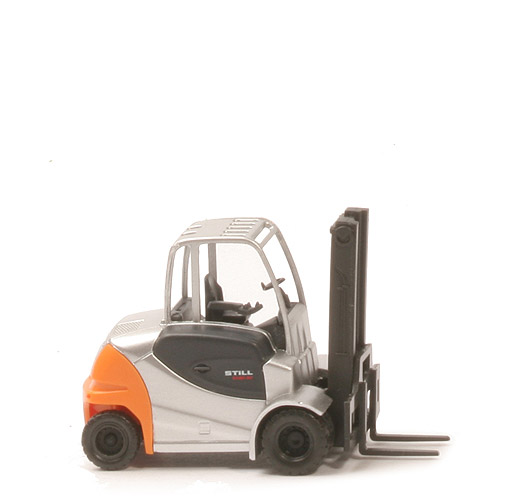 Aufbau | silber | Schutzdach | silber | Gegengewicht | orange | Inneneinrichtung, Lenkrad | schwarz | Fahrer | ohne | Batterieabdeckung | anthrazit | Hubarm | anthrazit | bewegliche Gabel | anthrazit | Räder vorne | 2-teilig, 9,5 mm, Felge schwarz | Räder hinten | 8 mm, Felge schwarz | Chassis | anthrazit | Bodenprägung | neues WIKING-Logo | Bedruckung Heck | Still (schwarz) | Beschriftung Batterieabdeckung | Still (weiß), RX60-80 (rot) | Beschriftung Hubarm links | Still (weiß) |