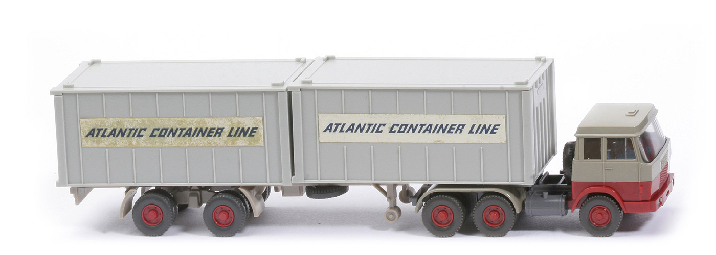 | Zugmaschine | Kabine oben | olivgrau | Kabine unten | hellbraunrot | Verglasung | getönt | Inneneinrichtung | 3 Sitze, ca. azurblau | Lenkrad | ohne | Chassis | basaltgrau | Radlauf hinten | olivgrau, einteilig | Sattelpfanne | für großen Königsbolzen | Reserverad | hinter Kabine | Räder | Profil grob | Felgen | hellbraunrot | | Container | Art | 2 x 20 ft gerippt | Farbe | platingrau | Beschriftung | Atlantic Container Line (s. Foto) | Beschriftung Art | 7 Felder, Papieraufkleber, glänzend | | Auflieger | Farbe | olivgrau | Unterfahrschutz | ohne | Königsbolzen | stark | Räder | Profil grob | Felgen | hellbraunrot |
