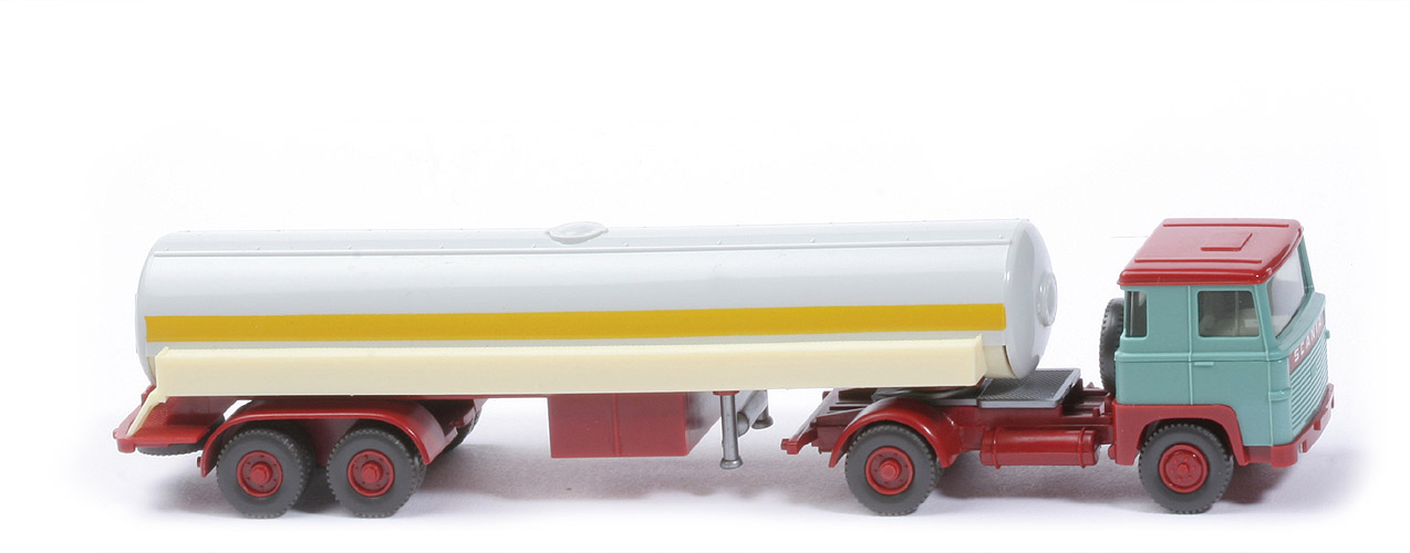 | Zugmaschine | Dach | braunrot | Kabine oben | türkis | Kabine unten | türkis | Stoßstange | braunrot | Frontbeschriftung | Scania breit | hier Farbhinterlegung | braunrot | Grill Prägung | mit 110 | Scheinwerfer | in der Stoßstange, gesilbert | Spiegel | ohne | Scheibenwischer | ohne | Lenkrad | ohne | Sattelpfanne | für großen Königsbolzen | Reserverad | hinter Kabine | Chassis Farbe | braunrot | Rücklichtstangen | mit | Räder | 12mm, Profil grob | Felgen | hellbraunrot | | Auflieger | Tank | altweiß | Galerie | creme | Chassis | braunrot | Achseinheit | braunrot | Stütze | Hydraulikstempel, silber | Reserverad | hinter Achseinheit | Beschriftung Heck | Frigen | Beschriftung Art | Papieraufkleber | gelber Streifen | mit | Räder | 12mm, Profil grob | Felgen | hellbraunrot |