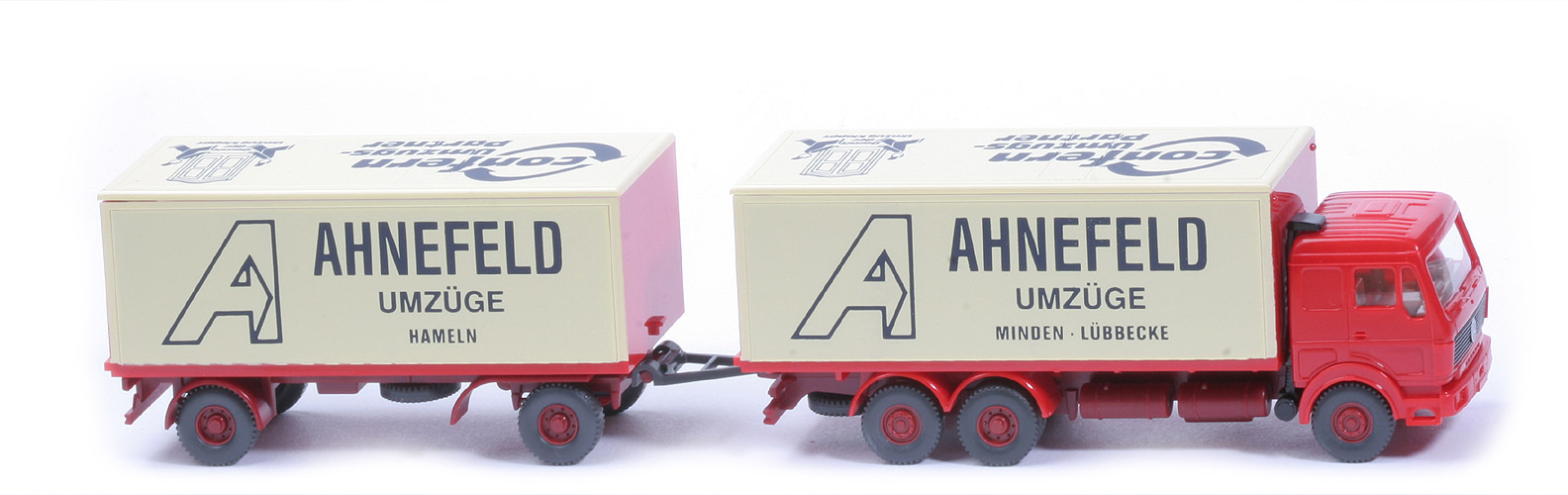 | Zugwagen | Kabine Farbe | rot | hintere Seitenfenster | geschlossen | Scheibenwischer | mit | Heckfenster | geschlossen | eingesetzter Grill | schwarz, mit MB-Stern, ohne Streifen | Inneneinrichtung | ca. rotelfenbein, mit Lenkrad | Ansaugstutzen | schwarz, hinter Kabinenrückwand | Stoßstange | rot | Chassis | hellbraunrot, BP WIKING, Berlin-W | Radlauf hinten | 2-teilig, rot | Reserverad | hinten unter Chassis | Koffer Korpus | rot | Koffer Dach | creme | Koffer Türen | creme | Räder | 12 mm, Felgen 8-Loch, hellbraunrot | | Anhänger | Koffer Korpus | rot | Koffer Dach | creme | Koffer Türen | creme | Chassis | hellbraunrot | Drehschemel | hellbraunrot | Reserverad | mittig unter Chassis | Räder | 12 mm, Felgen 8-Loch, hellbraunrot | | Beschriftungen | Koffer Seiten | cremefarbend lackiert mit Druck Ahnefeld ... (s. Foto) | Koffer Vorderseite | ohne | Koffer Dach | Druck Cornfern (s. Foto) |