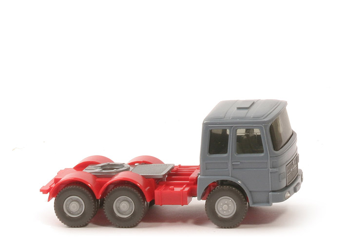 Fahrerhaus | graublau | Verglasung | getönt | Inneneinrichtung | ohne Lenkrad | Spiegel | keine | Scheibenwischer | keine | Lüftergitter | mit | Grill | silbern, ohne Löwe | Motorblock | silbern | Chassis | rot | Radlauf | rot, 2-teilig | Pritsche | ohne | Reserverad | mit | Räder | 12mm, Profil grob | Felgen | silbergrau |