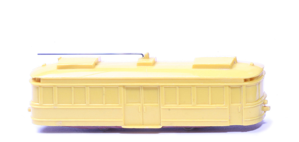 | Achsen | Rollachser | | Farbe Karosserie | elfenbein Lack | | Grundfarbe | mischbunt | | Scheiben | nicht gesilbert | | gewinkelter Isolator | fehlt hier | | extra Halterung Stromabnehmer | ohne | | Stromabnehmer | Stange, eingeschmolzen | | Chassis Typ | ohne Kupplungen | | Achshalterung | mittige Fixierung | | Chassis Farbe | mischbunt | | Bodenprägung | WM | | Räder | glasig hellgrau |