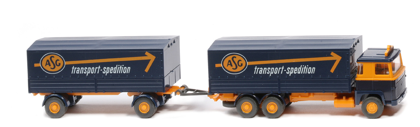 | Zugwagen | Kabinendach | stahlblau | Kabine oben | melonengelb | Kabine unten | stahlblau | Stoßstange | stahlblau | Frontbeschriftung | Scania schmal | Farbhinterlegung | stahlblau | Prägung Grill | mit 110 | Scheinwerfer | in der Stoßstange, gesilbert | Spiegel | ohne | Scheibenwischer | ohne | Lenkrad | ohne | Chassis | melonengelb | Radlauf hinten | 2-teilig | Pritsche | stahlblau | Plane | stahlblau | Beschriftung | ASG (s. Foto) | Räder | 12mm, Profil grob | Felgen | melonengelb | | Hänger | Pritsche | stahlblau | Chassis | melonengelb | Plane | stahlblau | Beschriftung | ASG (s. Foto) | Pritscheneinlagen | silber, Folie | Räder | 12mm, Profil grob | Felgen | melonengelb |