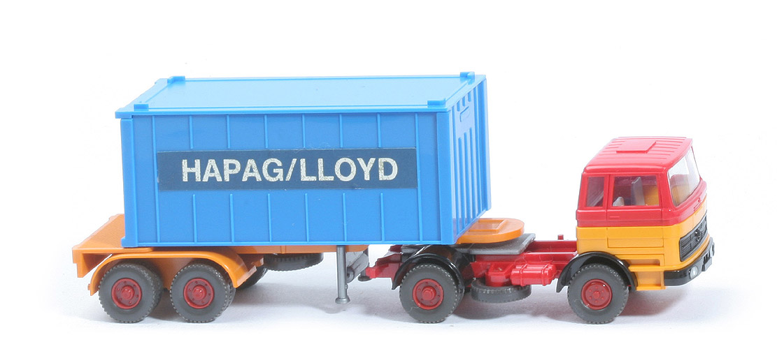 | Zugmaschine | Kabine oben | rot | Kabine unten | melonengelb | Streifen | ohne | Verglasung | klar | Inneneinrichtung | ca. silbergrau | Lenkrad | ohne | Grill | schwarz | Stoßstange, Radlauf vorn | schwarz | Chassistyp | neu | Chassisfarbe | rot | Radlauf hinten | schwarz | Reserverad | unter Chassis | Sattelpfanne | für großen Königsbolzen | Räder | 12mm, Profil grob | Felgen | hellbraunrot | | Container | Art | 1 x 20 ft gerippt | Farbe | himmelblau | Türen | alt | Beschriftung | Hapag-Lloyd ... (s. Foto) | Beschriftung Grösse | 7 Felder, Papieraufkleber | | Auflieger | Farbe | gelborange | Variante | mit Markierung | Achseinheit | gelborange | Königsbolzen | stark | Räder | 12mm, Profil grob | Felgen | hellbraunrot |