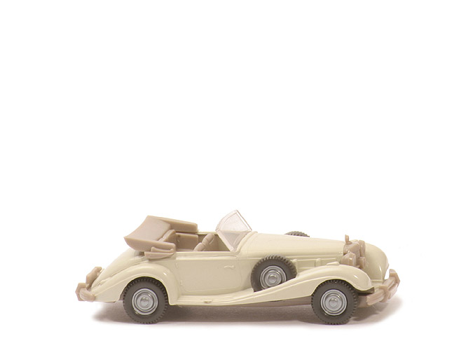 Farbe | grauweiß | Grill | graubeige eingesetzt | Reserveräder | auf vorderen Kotflügeln | Frontscheibe | klar transparent | Inneneinrichtung | graubeige | Lenkrad | eingesetzt | Verdeck | graubeige | Bemalung Rückleuchten | ohne | Chassisfarbe | graubeige | Bodenprägung | Mercedes/540K/WIKING/Germany | Räder | 9 mm | Radkappen | silbern eingesetzt |