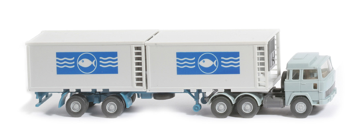 | Zugmaschine | Kabine oben | hellblaugrau | Kabine unten | hellblaugrau | Verglasung | klar | Inneneinrichtung | graubeige | Lenkrad | mit | Grill | silber | Chassis | staubgrau | Radlauf hinten | hellblaugrau, 2-teilig | Sattelpfanne | für großen Königsbolzen | Reserverad | hinter Kabine | Räder | Profil grob | Felgen | silbergrau | | Container | Art | 2 x 20 ft Kühlcontainer | Farbe | altweiß | Kühlaggregat | silbern | Türen | alt | Beschriftung | Fischsymbol | Beschriftung Art | Druck blau | | Auflieger | Farbe | azurblau | Unterfahrschutz | mit | Rückstrahler | am Auflieger | Königsbolzen | stark | Räder | Profil grob | Felgen | silbergrau |