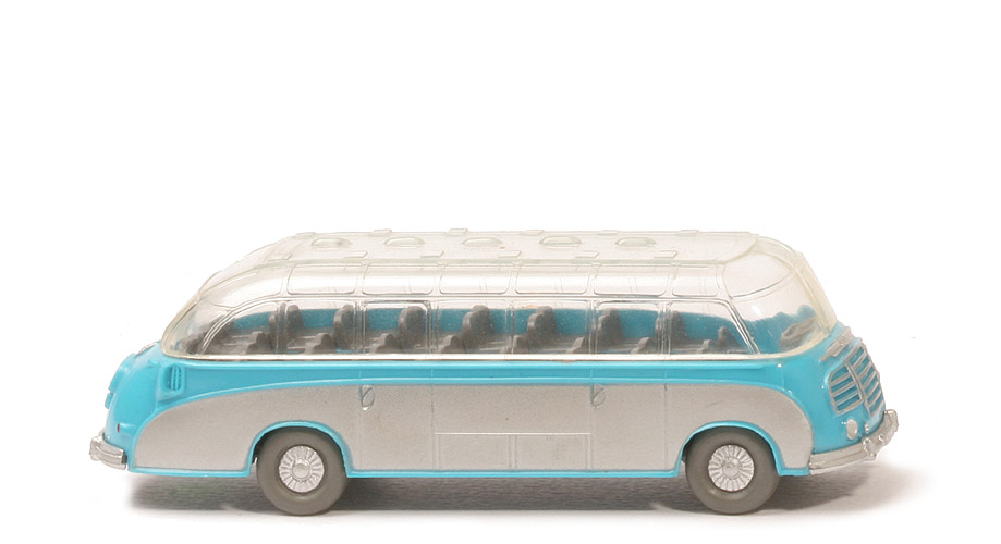 Karosserie Typ | Serie | Karosserie Farbe | dunkeladriablau | Schlitze für Dach | fast quadratisch | Armaturenbrett | rechteckig | Gestaltung Zierline Front | mit Punkt, gesilbert | Boden Fahrgastraum | glatt | Gestaltung Seite | Schablonierung silber | Fahrersitz Farbe | basaltgrau | Sitzreihen | basaltgrau, gesteckt | Fahrer | ohne Fahrer | Lenkrad Typ | groß, zwei Speichen | Lenkrad Farbe | ca. basaltgrau | Dach Befestigung | nur gesteckt | Dach Gestaltung oben | glatt, ohne Schablonierung | Dach Typ Haltenasen | fast quadratisch | Chassis Farbe | basaltgrau | Chassis Typ | Typ 2 | Achshalterungen hierbei | geschlossen | Bodenprägung hierbei | WM im Kreis | Bemalung Hauptscheinwerfer | silber | Bemalung Nebelscheinwerfer | silber | Bemalung Grill und Zierlinie | silber | Bemalung Stoßstangen | silber | Bemalung Rückleuchten | rot | Bemalung Blinker hinten | rot | Bemalung Kennzeichen hinten | silber | Bemalung 3 Zierlinien hinten | silber | Bemalung Lüfter | ohne | Räder Typ | Trilex Bus, ohne Profil | Räder Ausführung | staubgrau, Felgen gesilbert |
