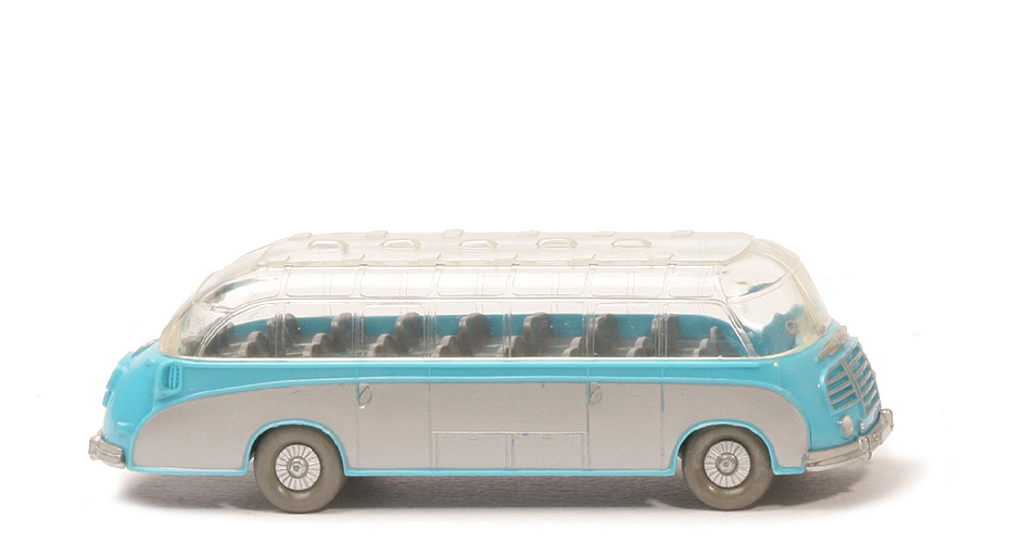 Karosserie Typ | Serie | Karosserie Farbe | (helles) adriablau | Schlitze für Dach | lang und breit | Armaturenbrett | trapezförmig | Gestaltung Zierline Front | mit Punkt, gesilbert | Boden Fahrgastraum | glatt | Gestaltung Seite | Schablonierung silber | Fahrersitz Farbe | basaltgrau | Sitzreihen | basaltgrau, gesteckt | Fahrer | ohne Fahrer | Lenkrad Typ | groß, zwei Speichen | Lenkrad Farbe | ca. basaltgrau | Dach Befestigung | geklebt | Dach Gestaltung oben | glatt, ohne Schablonierung | Dach Typ Haltenasen | lang und breit | Chassis Farbe | basaltgrau | Chassis Typ | Typ 2 | Achshalterungen hierbei | geschlossen | Bodenprägung hierbei | WM im Kreis | Bemalung Hauptscheinwerfer | silber | Bemalung Nebelscheinwerfer | silber | Bemalung Grill und Zierlinie | silber | Bemalung Stoßstangen | silber | Bemalung Rückleuchten | rot | Bemalung Blinker hinten | rot | Bemalung Kennzeichen hinten | silber | Bemalung 3 Zierlinien hinten | silber | Bemalung Lüfter | ohne | Räder Typ | Trilex Bus, ohne Profil | Räder Ausführung | staubgrau, Felgen gesilbert |