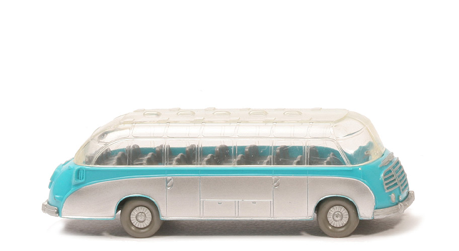 Karosserie Typ | Serie | Karosserie Farbe | dunkeladriablau | Schlitze für Dach | fast quadratisch | Armaturenbrett | rechteckig | Gestaltung Zierline Front | mit Punkt, gesilbert | Boden Fahrgastraum | glatt | Gestaltung Seite | Schablonierung silber | Fahrersitz Farbe | basaltgrau | Sitzreihen | basaltgrau, gesteckt | Fahrer | ohne Fahrer | Lenkrad Typ | groß, zwei Speichen | Lenkrad Farbe | ca. basaltgrau | Dach Befestigung | geklebt | Dach Gestaltung oben | glatt, ohne Schablonierung | Dach Typ Haltenasen | fast quadratisch | Chassis Farbe | basaltgrau | Chassis Typ | Typ 2 | Achshalterungen hierbei | geschlossen | Bodenprägung hierbei | WM im Kreis | Bemalung Hauptscheinwerfer | silber | Bemalung Nebelscheinwerfer | silber | Bemalung Grill und Zierlinie | silber | Bemalung Stoßstangen | silber | Bemalung Rückleuchten | rot | Bemalung Blinker hinten | rot | Bemalung Kennzeichen hinten | silber | Bemalung 3 Zierlinien hinten | silber | Bemalung Lüfter | ohne | Räder Typ | Trilex Bus, ohne Profil | Räder Ausführung | staubgrau, Felgen gesilbert |