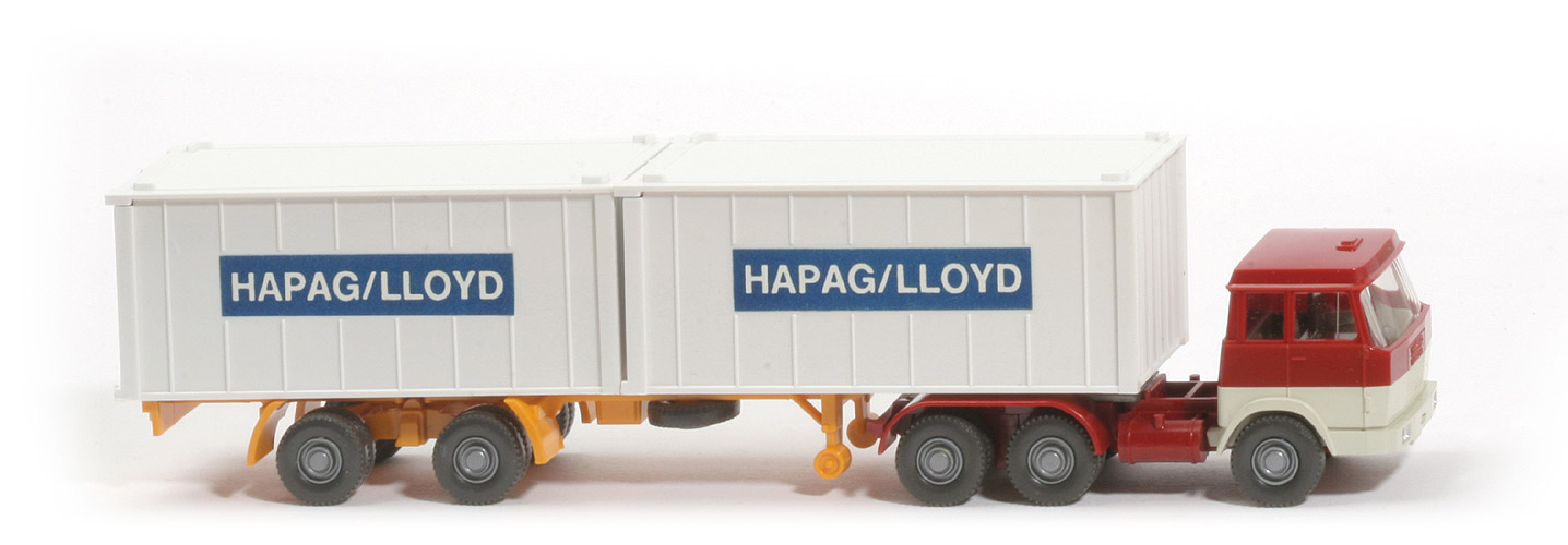 | | Zugmaschine | | Kabine oben | hellbraunrot | | Kabine unten | perlweiß | | Verglasung | klar | | Inneneinrichtung | 2 Sitze, Motorblock, schokobraun | | Lenkrad | ohne | | Chassis | hellbraunrot | | Radlauf hinten | hellbraunrot, einteilig | | Sattelpfanne | für großen Königsbolzen | | Reserverad | ohne | | Räder | Profil grob | | Radkappen | silber | | | Container | | Art | 2 x 20 ft gerippt | | Farbe | reinweiß | | Beschriftung | Hapag-Lloyd (s. Foto) | | Beschriftung Art | 5 Felder, Papieraufkleber | | | Auflieger | | Farbe | melonengelb | | Unterfahrschutz | ohne | | Königsbolzen | stark | | Räder | Profil grob | | Radkappen | silber |