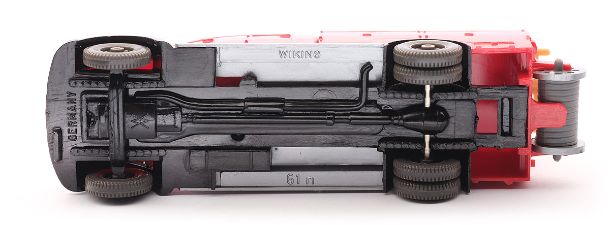 Die zweite Feuerwehrversion des Chassis ähnelt dem Chassis Typ 3 - auch hier ohne Zughaken. Hier nun vorne mit Germany-Gravur. Die vorne halbrunde Aussparung der Kardanplatte ist zu sehen und wird noch nicht von einem kleinen Kasten am Chassis übergriffen. Ansonsten: breite Kardanplatte, die den Blick auf das durchbrochene Chassis verschließt, der hinten offene Chassisbereich hat nach innen einen offenen Kasten, ohne vordere Kupplung. Weiteres Detail: an der Kardanplatte ist die vordere Achshalterung verbreitert worden.