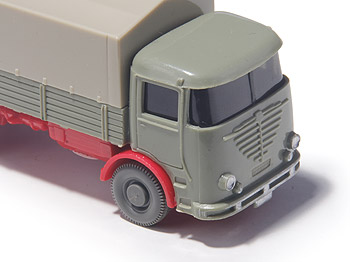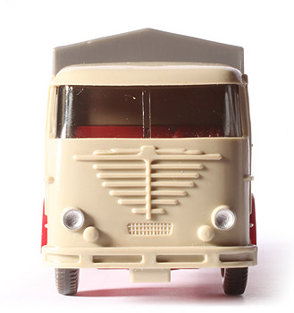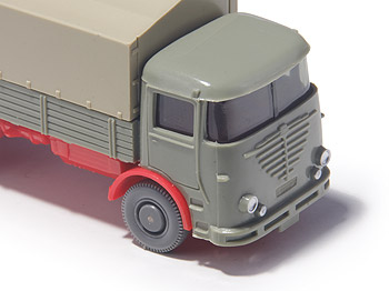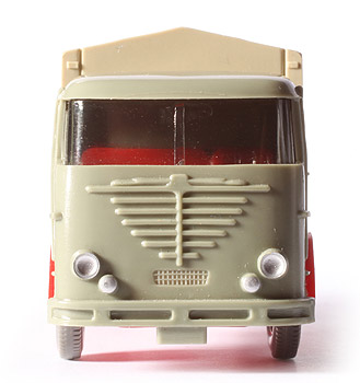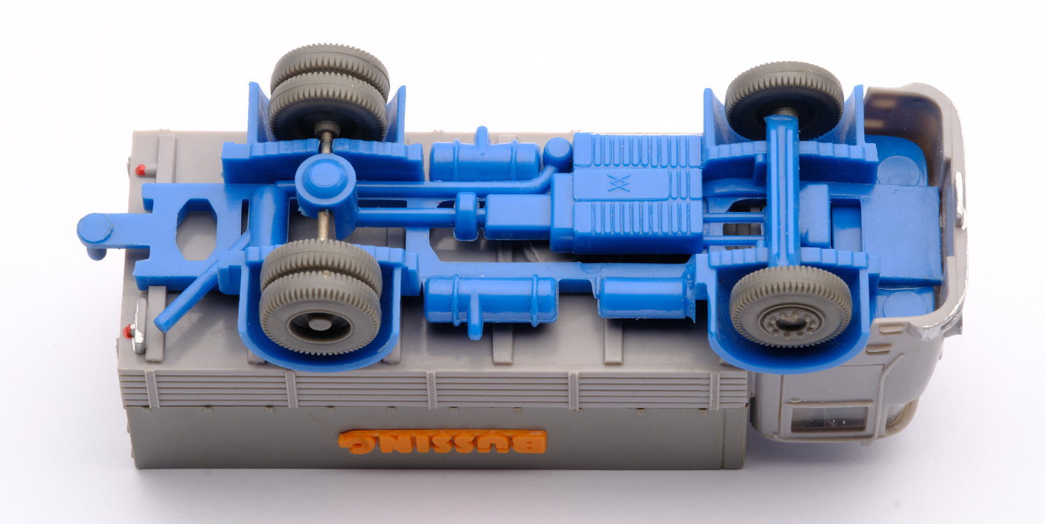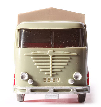 Bei den ersten Versionen 1958 bis in 1959 hinein hatte das Modell noch keine Plane. Bei dieser Version waren regelmäßig die Büssing-Spinne, die Haupt- und Nebelscheinwerfer sowie das Nummernschild gesilbert, nicht jedoch die Stoßstange zeige die Modelle mit diesem Detail |