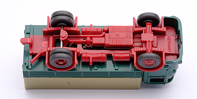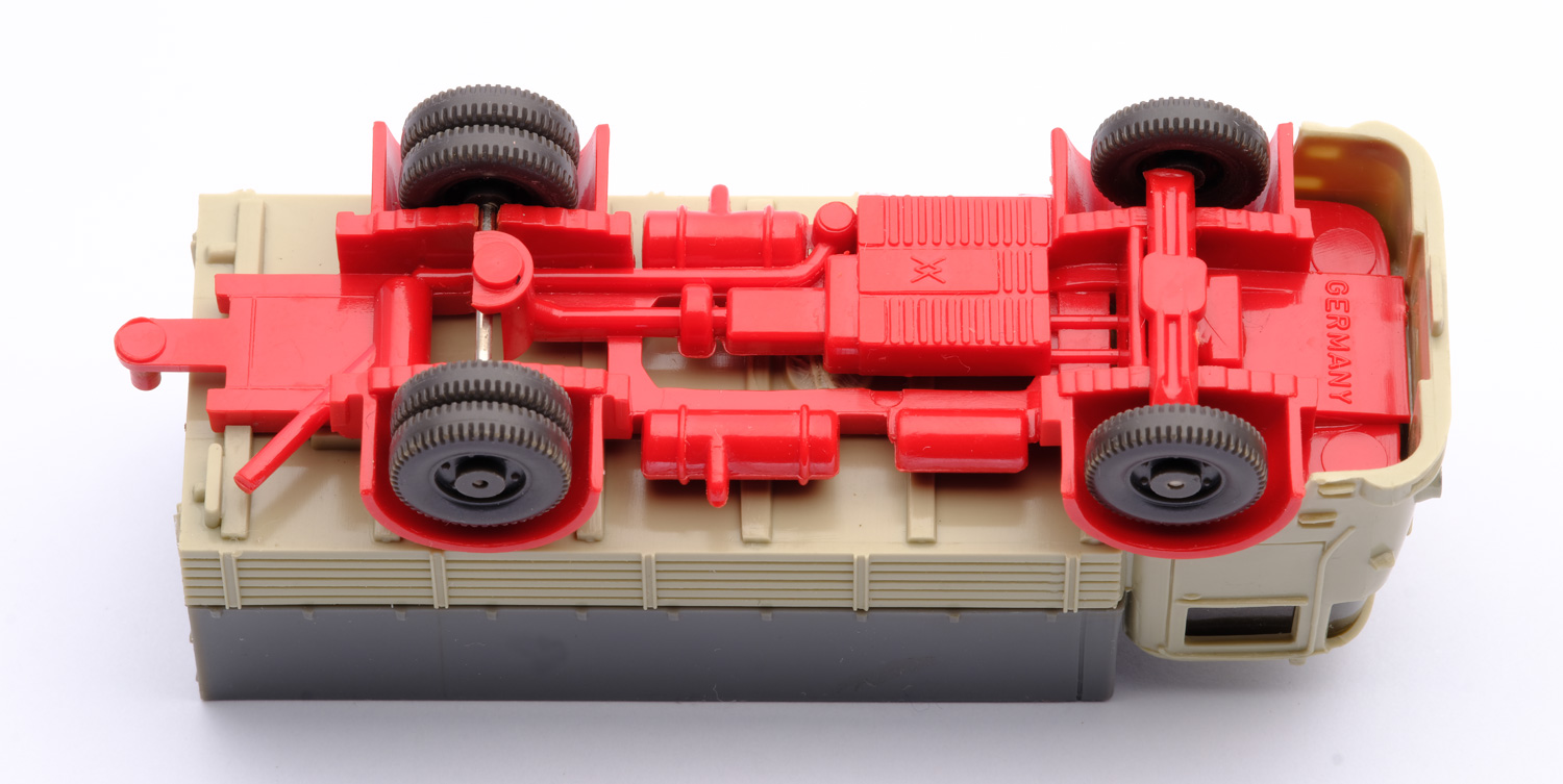 Ganz zum Ende der Produktionszeit erfolgte 1968 noch diese Änderung: Vorne unter dem Chassis wude die Gravur "Germany" angebracht. Zudem wurde hinter der Vorderachse ein Quersteg installiert. Eine sehr seltene Variante. ![]() zeige die Modelle mit diesem Detail |