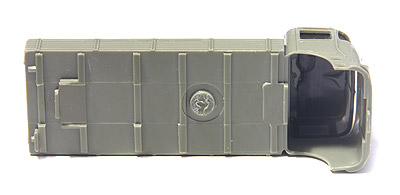 Bei der zweiten Chassis-Version ist die Fläche hinter dem Zughaken geschlossen. Zu dieser Version gehören weitere Details: Die Achshalterung hinten übergreift die Achse nicht mehr, so dass die Achse von hinten eingeklipst werden kann. Das Kardan- getriebe ist nicht mehr kreisrund dargestellt, sondern es fehlt ein Kreissegment. In Fahrtrichtung rechts ist das Chassis zwischen Kardanwelle und Chassis geschlossen. Hinter der vorderen Achsaufhängung öffnet sich das Chassis unter zwei Streben gerade. Vor der Vorderachse ist das Areal geschlossen, das bei der Vorgängerversion noch offen war.