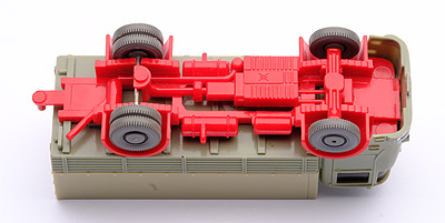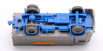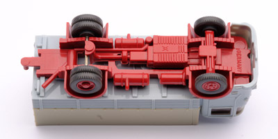 Später wurde der Aufbau mit dem Chassis über große Klebeflächen vorne und hinten unter der Pritsche verbunden. Hinten erhielt die Klebeaufnahme zur Seite und hinten noch Führungsstege, um ein sicheres Platzieren des Chassis beim Verkleben zu gewährleisten. Die vordere Klebeaufnahme zog sich nun durchgehend bis zum Fahrerhaus. Dies betrifft die Versionen mit der Verglasung Typ 3. Die korrespondierenden Flächen am Chassis wurden entsprechend auch vergrößert (Chassis hinten geschlossen).