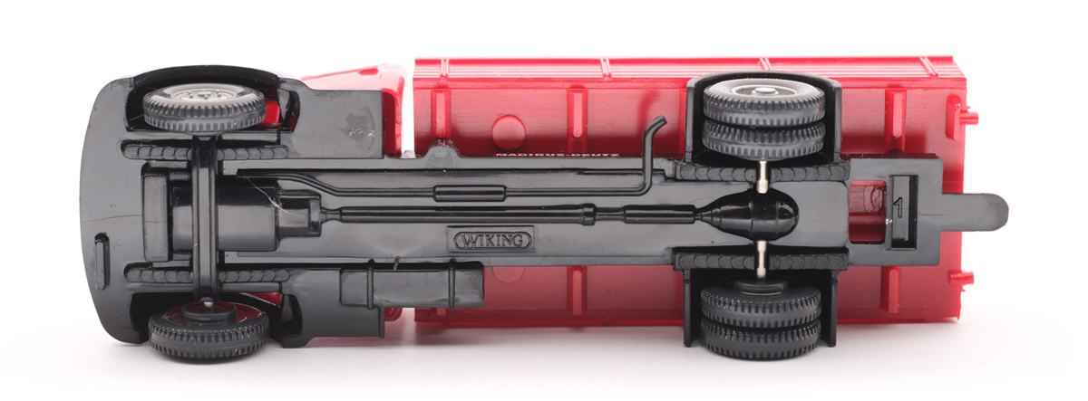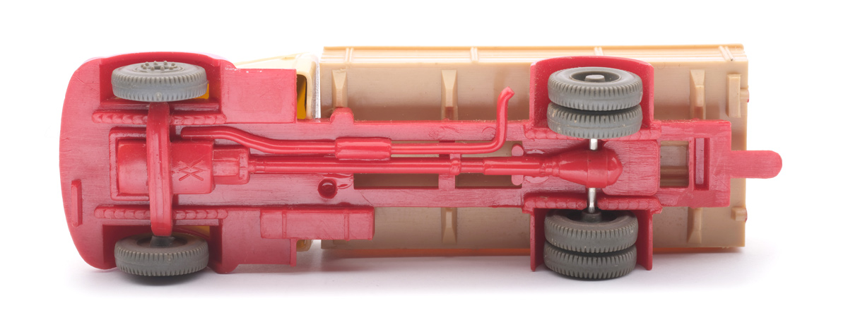 Vorserie ohne Bodenprägung "WM" - hier Chassis in rot. Weitere Besonderheit: Im Bereich der hinteren Achshalterung ist das Chassis durchbrochen. Graziles Kardan - mittig öffnet sich der Blick auf das durchbrochene Chassis. Der hinten offene Chassisbereich hat nach innen eine Abtreppung. Hier in rot. zeige die Modelle mit diesem Detail |