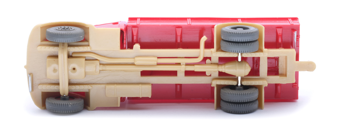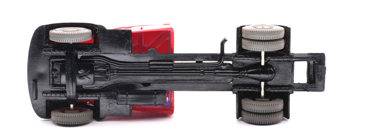 Die erste Feuerwehrversion des Chassis entspricht dem Chassis Typ 2 - nur das in der Form der Zughaken entfernt wurde. D.h. breite Kardanplatte (mit vorne halbrunder Aussparung), die den Blick auf das durchbrochene Chassis verschließt, der hinten offene Chassisbereich hat nach innen einen Kasten, das vordere Kennzeichen verspringt gegenüber der Stossstange etwas nach hinten, ohne vordere Kupplung. Ohne Germany-Gravur. zeige die Modelle mit diesem Detail |