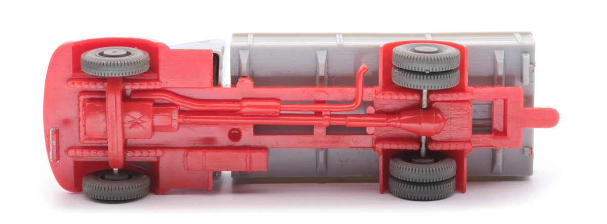 Die mittlere Version hat eine breite Kardanplatte (mit vorne halbrunder Aussparung), die den Blick auf das durchbrochene Chassis verschließt. Der hinten offene Chassisbereich hat nach innen einen Kasten. Das vordere Kennzeichen verspringt gegenüber der Stossstange etwas nach hinten. Immer ohne Kupplung. Hier in rot. zeige die Modelle mit diesem Detail |