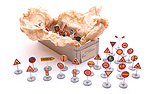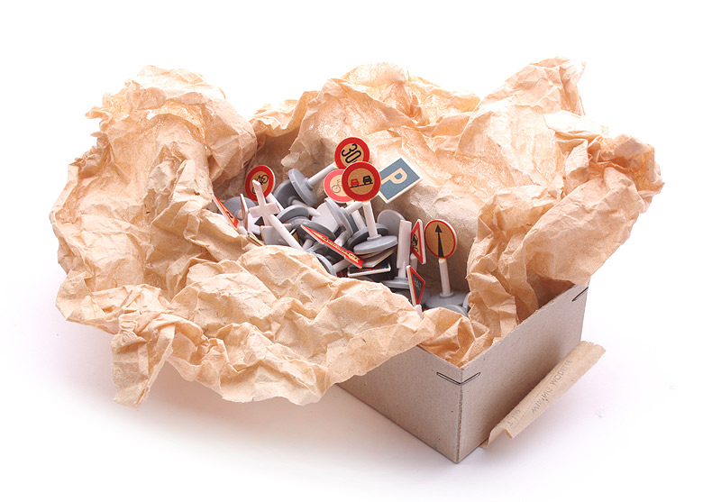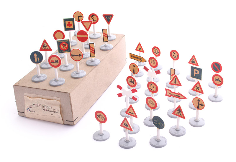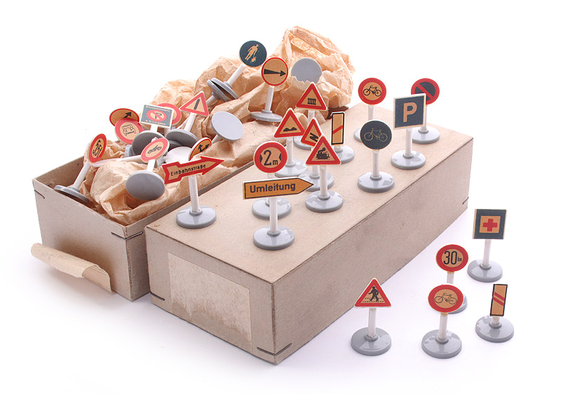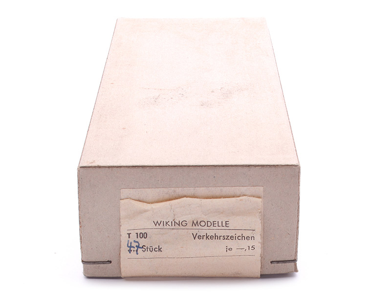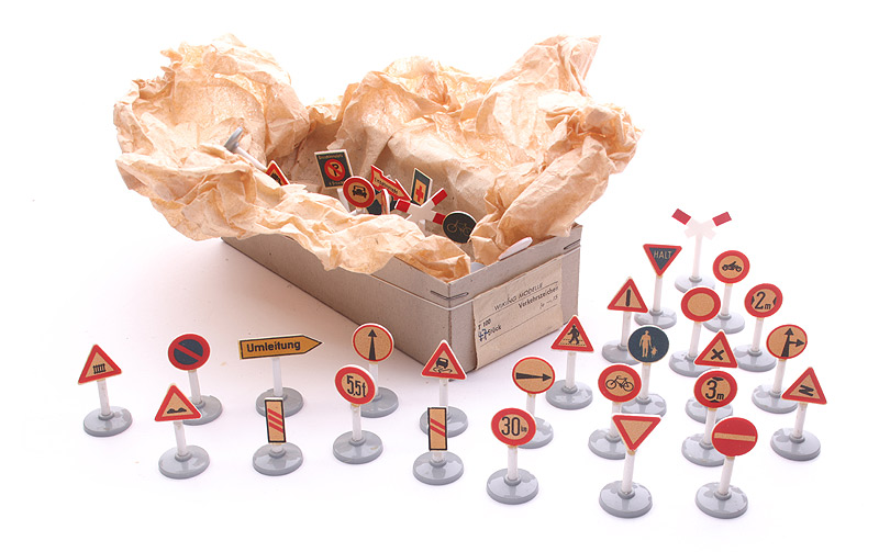 Bemerkungen: Karton mit Verkehrzeichen zum Einzelvekauf für --,15 das Stück. Befüllt ist dieser Karton mit den etwas späteren Verkehrzeichen mit Abziehbild mit den hellgrauen Sockeln mit WM im Kreis auf der Oberseite des Sockels. Die Anzahl der Verkehrsschilder ist handschriftlich mit "47" an der entsprechenden freigelassenen Stelle der Banderole vermerkt. Offenbar sind schon ein paar abverkauft. Nach GK 1000/2 gab es diese Version von 1952 - 1955. Wunderbares Ensemble. |