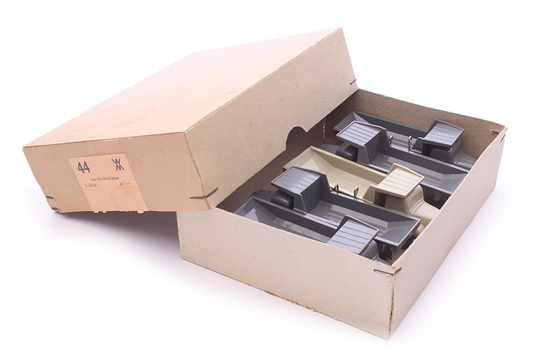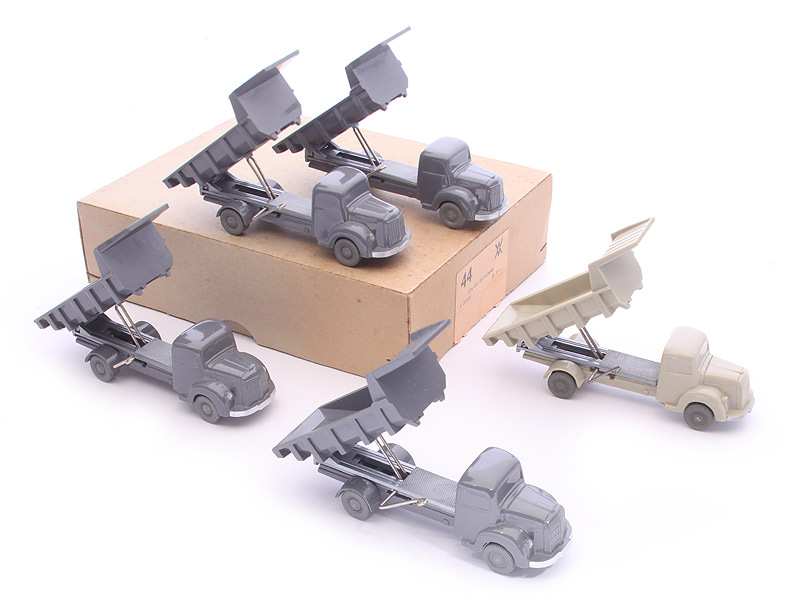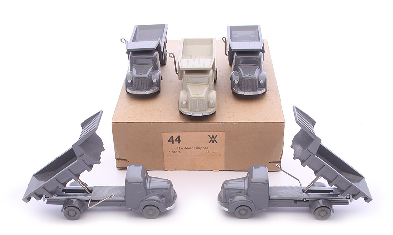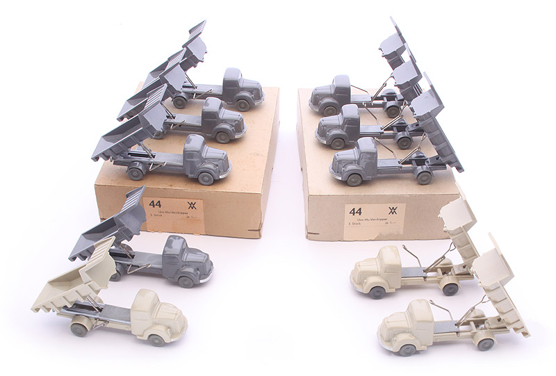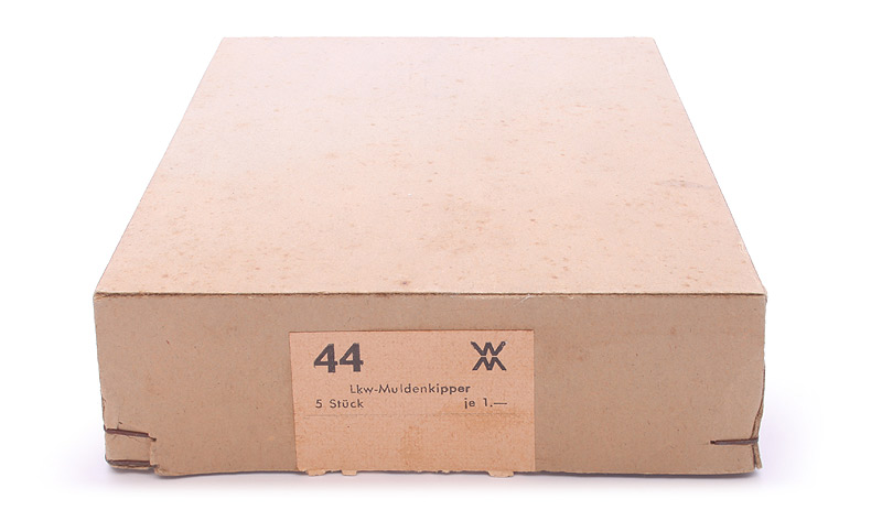 Spannender Verlauf in der Bildpreisliste. Zunächst T 44, dann 44, dann 67 und zu Schluss 671: der Muldenkipper. Kartons mit WM ohne Kreis gab es ab 1958. In der Preisliste von 1960 hatte das Modell schon die Nummer "67". Also 1958 und 1959.