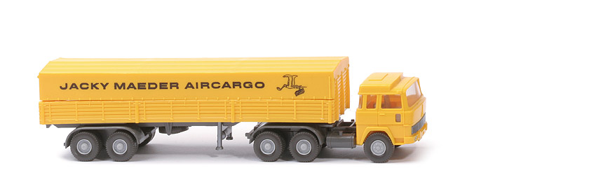 Holzpritsche ohne Lasche , Chassis: basaltgrau, Pritscheneinlage: hellgelbgrau, Doppelachsaggregat: Klemmplatte, Doppelachsaggregat Farbe: basaltgrau, Bodenprägung Achseinheit: Germany/Wiking, Reserverad: ja, Stütze: starr, Stempel silbern, Plane: gelb, Plane Art: Seite 1 Mark., vorne offen, Beschriftung: Jacky Maeder Aircargo, Art der Beschriftung: schwarzer Druck, Räder: Profil grob, Felgen: silbergrau, 1974