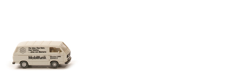 Farbe Karosserie: grauweiß, Grill und Lüftergitter: schwarz eingesetzt, Verglasung: klar, Inneneinrichtung: Sitze nur eine Reihe, Lkr integriert, Farbe Inneneinrichtung: ca. hellgelbgrau, Chassis Farbe: schwarz, Bodenprägung: Wiking Berlin-W, Beschriftung Seiten: "Mobilfunk "... (s. Foto), Beschriftung Heck: "Siemens", Beschriftung Art: Druck schwarz, Bemalung Scheinwerfer: ohne, Bemalung hinten: ohne, Räder: Riffelkappe, Felgen: gesilbert, Links Serienmodell "Mobiltelefone":