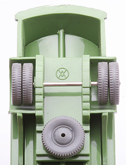 Das Chassis ist die Variante mit geschlossenen Achshalterungen. Die Bodenprägung des Firmenlogos ist WM ohne Kreis. Die Farbe des Chassis ist maigrün.