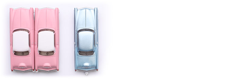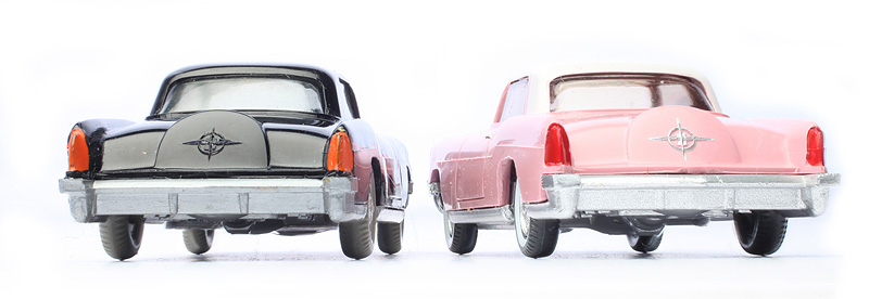 Die Wiederauflagen. Rechts eisblaumetallic Lack, links rosa mit weiß lackiertem Dach. Immer als Bodenprägung das neue WIKING-Logo (in Katalogen nicht erfasst). Chassis beim Modell aus der FORD-Packung mit Zughaken, bei Münster-Classic Modell ohne Zughaken. Ansonsten mit Stiften zur Fixierung der Verglasung und immer große Zapfen zur Befestigung der Chassisplatte. Räder: neuere Riffelkappe mit breiterer gerader Lauffläche, beim rosa Modell Weißwandreifen. Tönung der Verglasung: leicht getönt. Karosserieform nur 2 gesichtet. Grill gesilbert. Rückleuchten hübsch bemalt.