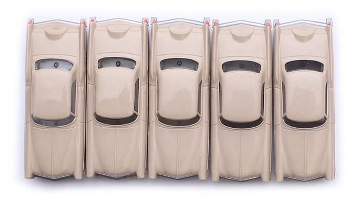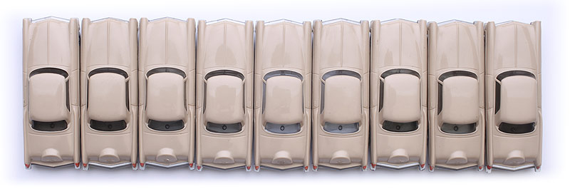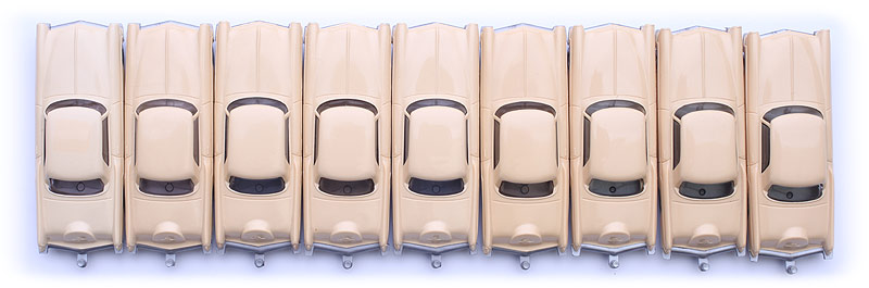 Mit den Farbtönen sind offensichtlich auch verschiedene Produktionszeiträume verbunden. Bei den 3 Modellen rechts sind noch die dünnen Stifte der kleinen Chassisplatte auszumachen - eine frühere Variante also. Jedoch haben alle 3 schon keine Grillsilberung mehr. Ein anderes hellbeiges Modell (--> Link) hat zwar die Grillsilberung, jedoch die großen Pass-Stifte. Dies passt nicht zusammen.