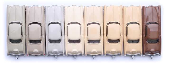 Ganz links: sehr helles hellbeige. Die vier folgenden: mittlerer Ton. Die vier Modelle rechts: deutlich dunkler. Diese Farbe könnte als die 210/4N im GK durchgehen: hellelfenbein