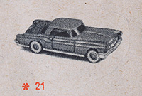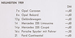 Der erste Auftritt dieses Autos dann war erst 1959 - da wurde das Original bereits 2 Jahre nicht mehr gebaut. In der WIKING Preisliste gab es keinen besonderen Hinweis im Text - er war einfach da. Das dieses Modell neu war, wurde nur durch den kleinen Stern gekennzeichnet. Unter der üblichen hübsch retuschierten perspektivischen Fotodarstellung mit den ersten Rädern stand schlicht "21".