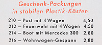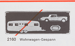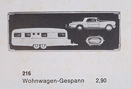 In der WIKING Bildpreisliste wurde die Packung ab 1968 als Nr. 216 und von 1974 bis 1978 als Nr. 2160 anonymisiert als "Wohnwagen-Gespann" geführt. Hierin zeigten Abbildungen der Geschenkpackungen stets eine sehr dunkle Schaumstoffeinlage und das Boot war in der Aufsicht zu sehen (s.o.).