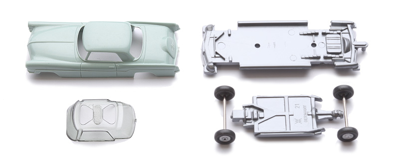 3.2. Chassis mit Zughaken, kleine Chassisplatte mit Bodenprägung WM 21 Germany und kleinen Pass-Stiften. Räder: Standard-Riffelkappe. Karosserieform 1 beschädigt. Verglasung geklebt. Grill ungesilbert. Rückleuchten unbemalt.