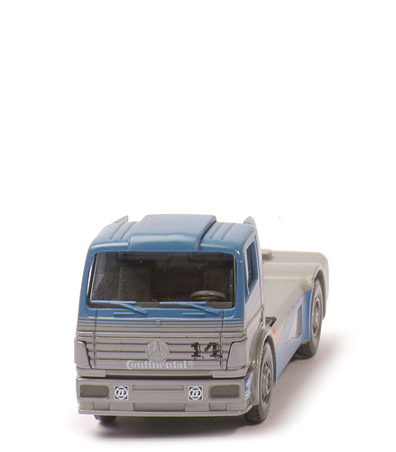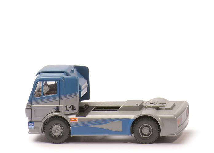 Die Renntrucks sind Zeugnisse der seinerzeit aufkeimenden Bedruckungskunst. Die einzelnen Details offenbaren die Bilder in Hochauflösung. Dies ist der Euromagazin-Truck. Das sieht man dem Modell nicht an, denn "Euromagazin" steht lediglich auf der MB-Podestschachtel. Markant: Startnummer 14. Dunkellilablau/silbern. |