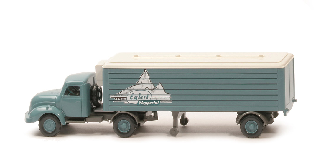 Die Kabine ist aus einer neuen Form. Einschlägige Ersterkennung an kurzen und dicken Blinkern. Die Rückleuchten der Zugmaschine und des Aufliegers sind rot bemalt.
