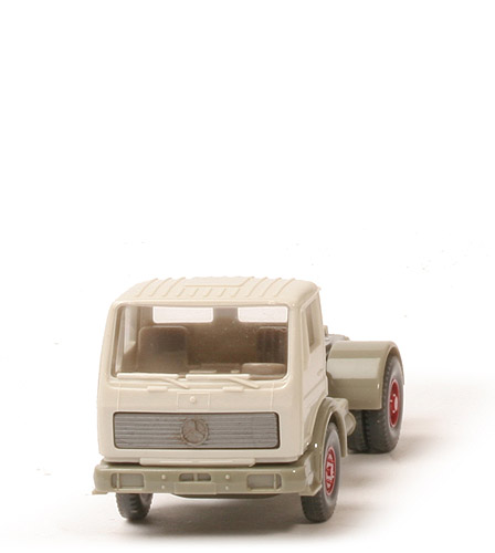 Das Modell hat einen sonst nicht bekannten eingesetzten Grill: Der MB-Stern ist nicht auf eine plane Fläche gedruckt sondern erhaben graviert. Auflieger anthrazit. GK: basaltgrau. Container Druckvariante: ohne Nummer, Druck matt, Breite 37mm (statt 38mm wie bei den anderen Containern ohne Nummer). |