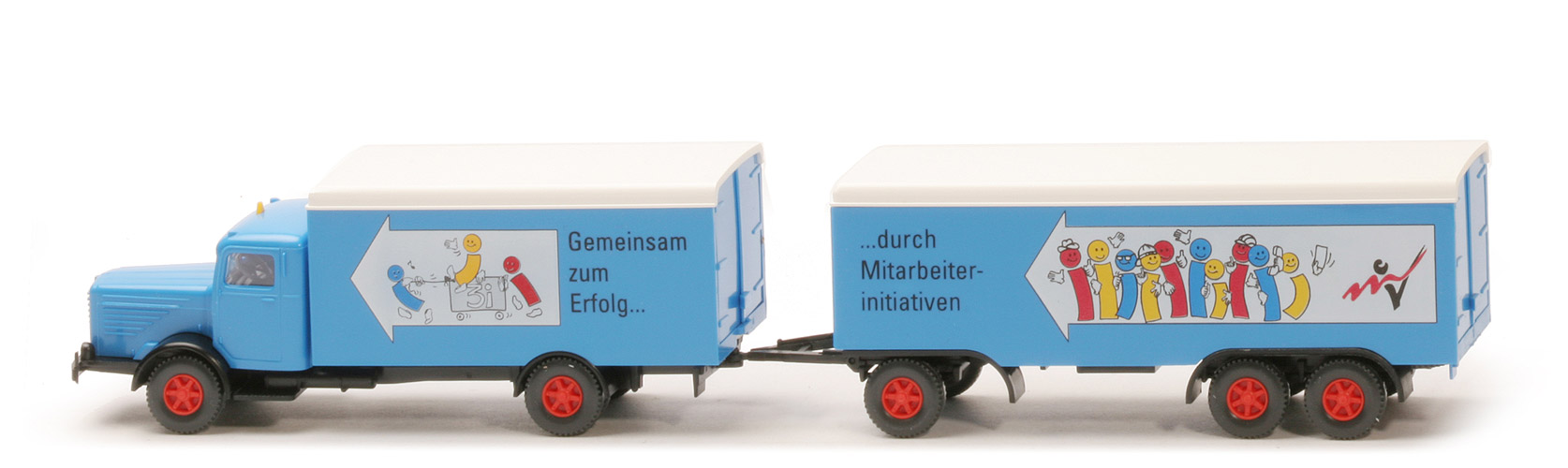 Zweite Version dieser Art des Büssing 8000 Koffer-Lastzugs. Das Chassis war beim Zugwagen und beim Anhänger fein detailliert und offen. Die Fixierung des Drehschemels des Anhängers erfolgte per graziler Halterung. Besonderheit: Das DAA endet hinten ca. 8 mm vor der Heck-Kante. |