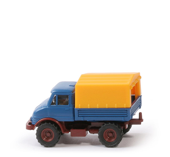 Vierzehntes Modell aus dem "kleinen WIKING-Laden" von Michi Bloeßl. Sehr schön filigran gedruckter Unimog-Schriftzug an der Front. Offizielle Farbbezeichnung: "azurblau/oxidrot". Das "Azurblau" entspricht nicht dem klassischen Azurblau der Wannerkarte. Besonderheit: Herr Bloeßl hat in eigener Initiative eine Stahlform für eine Plane fertigen lassen. Dem Modell sind Planen in ca. anthrazit und melonengelb beigefügt. Zusätzlich kann ein Planen-Set separat mit folgendenden dortigen Farbbezeichnungen bezogen werden: