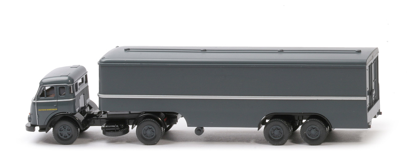In recht tristem Grau, aber mit eigenem Charme. Die offizielle Farbangabe "eisengrau" findet sich nicht in der Farbkarte von Herrn Wanner. Dort ähnlich: basaltgrau. Bedruckung recht aufwändig: waagerechte und senkrechte Zierleisten der Kabine in silbern, Frontdruck DB-Keks in weiß, Blinker orange, Rückleuchten an Zugmaschine und Auflieger in rot. Goldener Türdruck der Kabine "Deutsche Bundesbahn".