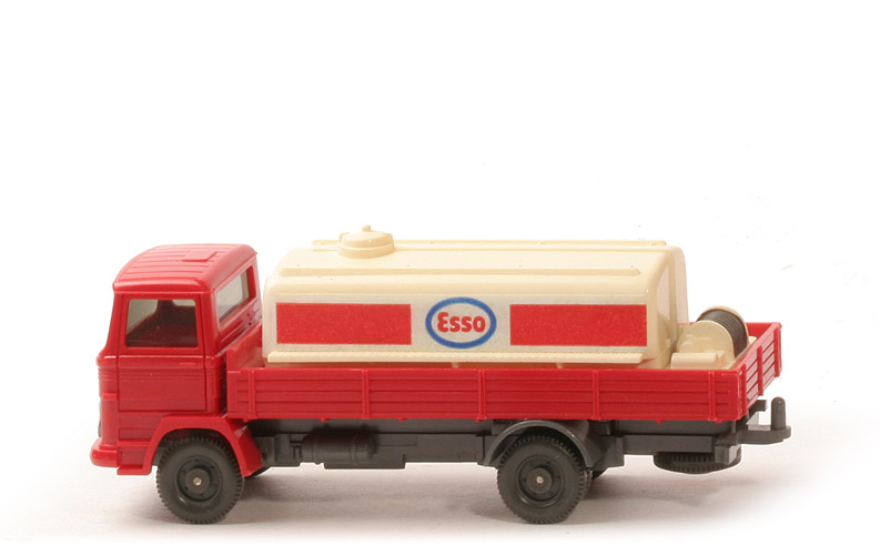 Vermutlich Versuchsmodell. Der etwas angegilbte Öltank mit Füllaggregat ist lose eingelegt. Für eine frühe Produktionszeit spricht der Papieraufkleber. Rote 1317 Pritschen-Lkw ohne Spiegel sind selten (hier: kräftiges Rot). Die Schlauchrolle ist anthrazitfarben bemalt.