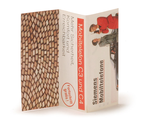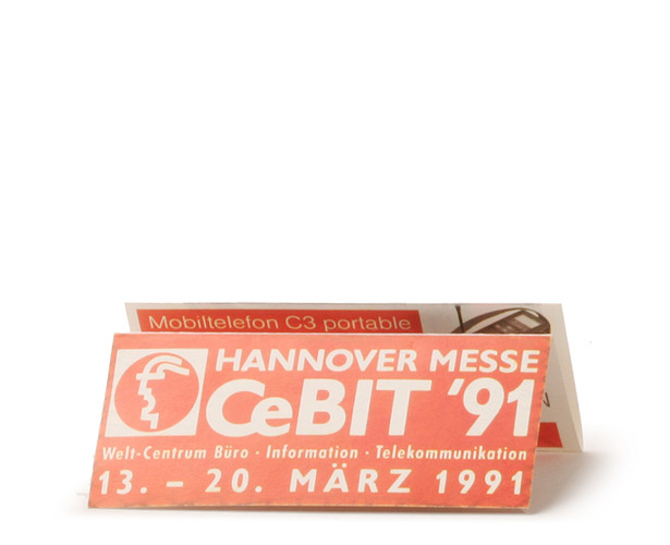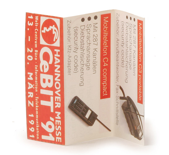 Mit 3-teiliger Leporello-Einlage. Hier basal mit Cebit 91. Um die schweren Mobiltelefone zu stemmen, waren eher muskulöse Frauen gefragt.