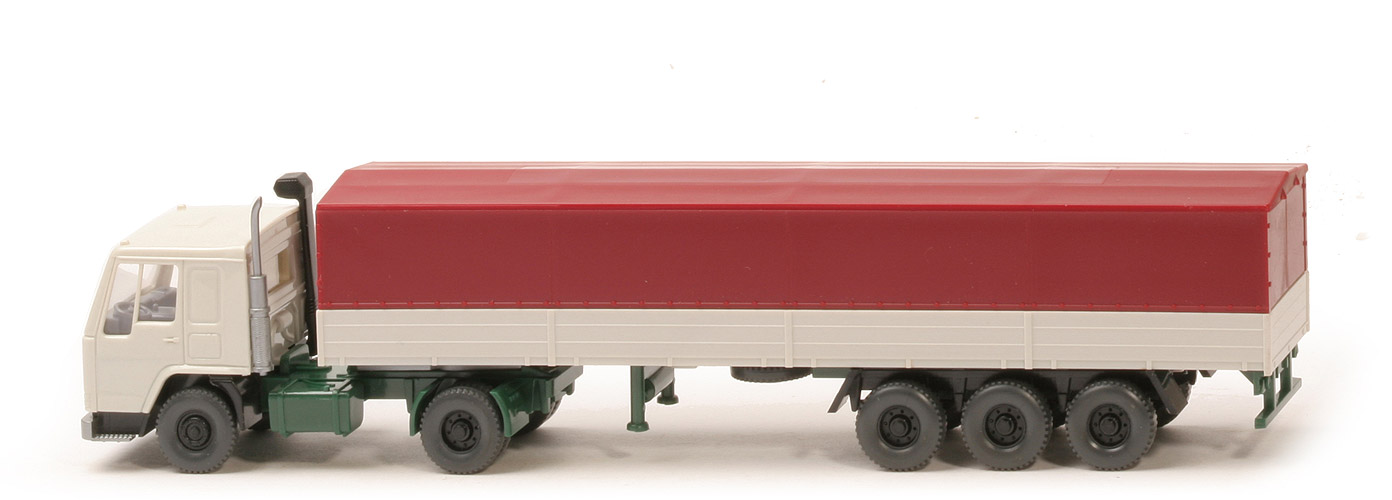 Unbekanntes Modell. Das Grundmodell entspricht dem Volvo FL 10 ASG-Zug. Hier in neutraler Ausführung in grauweiß / laubgrün. Die Farbgebung entspricht dem Volvo FL 10 Gastransporter. Auch der Trailer und das Dreiachsaggregat sind dort identisch. Die Pritsche wurde beim "Tress" verwendet. Im Prinzip zusammenzustecken. Nur die Plane in weinrot ist sonst nicht bekannt.