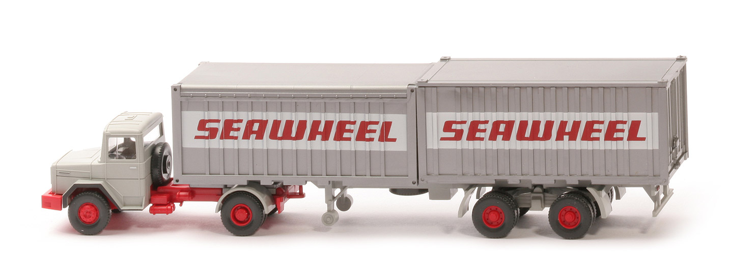 Durch neugeschaffenes Zugmaschinen-Chassis möglich gewordener Sattelzug. Die Kabine war bei den historischen Modellen nur bei 3-Achs-Baufahrzeugen zu finden. Wiederaufnahme des Themas "Seawheel" eines Liliput-Containers.